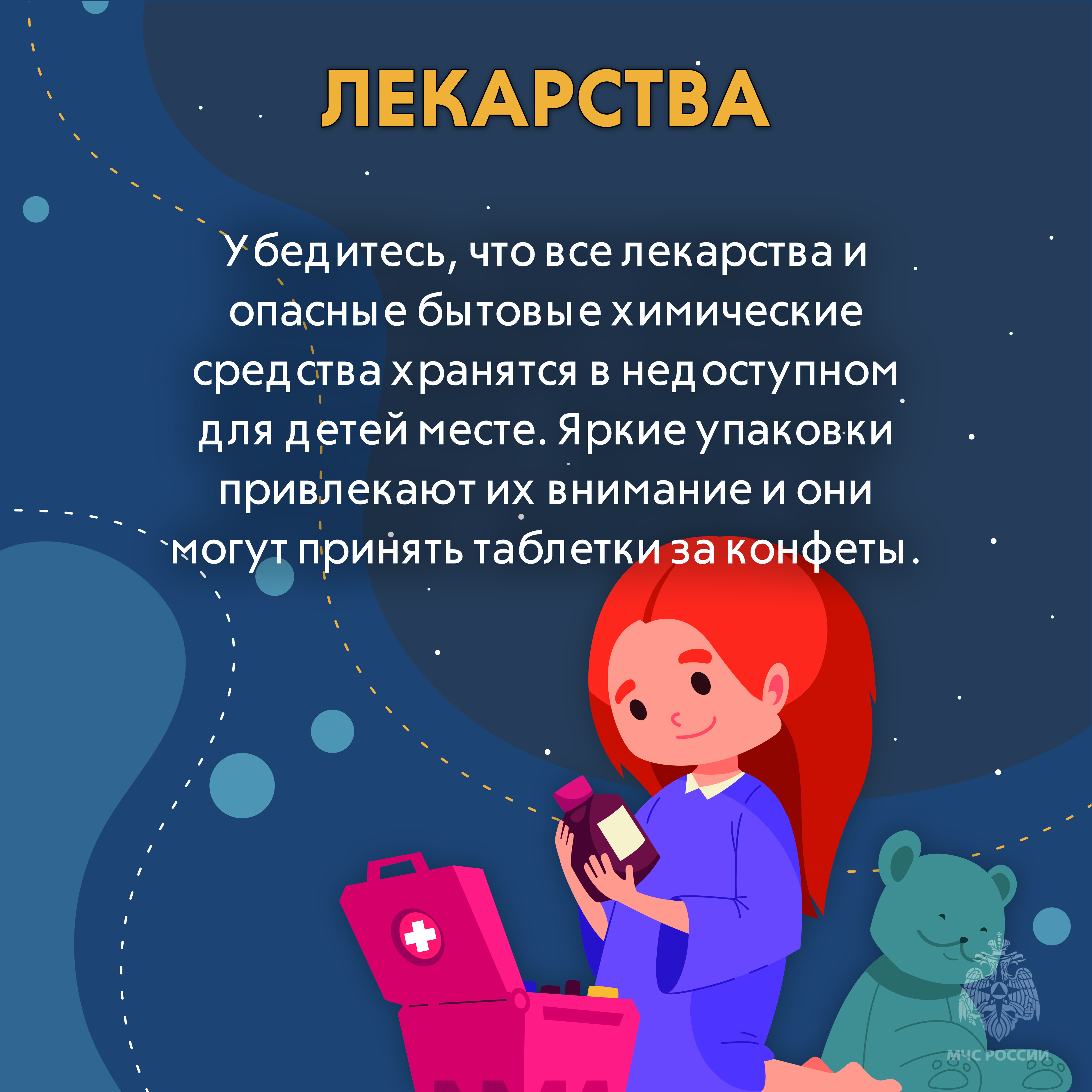 Отравления — чаще всего дети отравляются лекарствами из домашней аптечки – 60 процентов всех случаев отравлений. Лекарства, предназначенные для взрослых, могут оказаться смертельными для детей; медикаменты ребенку нужно давать только по назначению врача и ни в коем случае не давать ему лекарства, предназначенные для взрослых или детей другого возраста. Хранить медикаменты необходимо в местах совершенно недоступных для детей; отбеливатели, яды для крыс и насекомых, керосин, кислоты и щелочные растворы, другие ядовитые вещества могут вызвать тяжелое отравление, поражение мозга, слепоту и смерть. Яды бывают опасны не только при заглатывании, но и при вдыхании, попадании на кожу, в глаза и даже на одежду; ядовитые вещества, медикаменты, отбеливатели, кислоты и горючее ни в коем случае нельзя хранить в бутылках для пищевых продуктов — дети могут по ошибке выпить их. Такие вещества следует держать в плотно закрытых маркированных контейнерах, в абсолютно недоступном для детей месте; следите за ребенком при прогулках в лесу — ядовитые грибы и ягоды — возможная причина тяжелых отравлений; отравление угарным газом — крайне опасно для детей и сопровождается смертельным исходом в 80-85 процентах случаев — неукоснительно соблюдайте правила противопожарной безопасности во всех местах пребывания детей, особенно там, где есть открытый огонь (печи, камины, бани и т.д.).